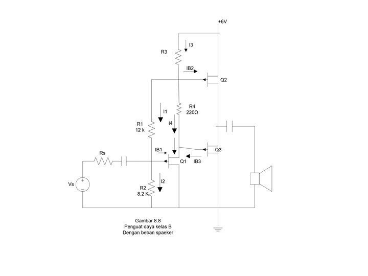 Contoh 8. 2 Untuk berikut (Gambar 8. 8) adalah penguat daya kelas B. Transistor Q 2 dan Q 3 adalah sepadan dengan hfe = 150. Transistor Q 1 mempunyai hfe = 50 a) Hitunglah arus lengang di semua resistor dan tentukan nilai R 3 sehingga VCE 3 = VCE 2 b) Hitung daya maksimum yang dapat diberikan kebeban speaker 4. bila resistans keluaran penguat daya diabaikan.
