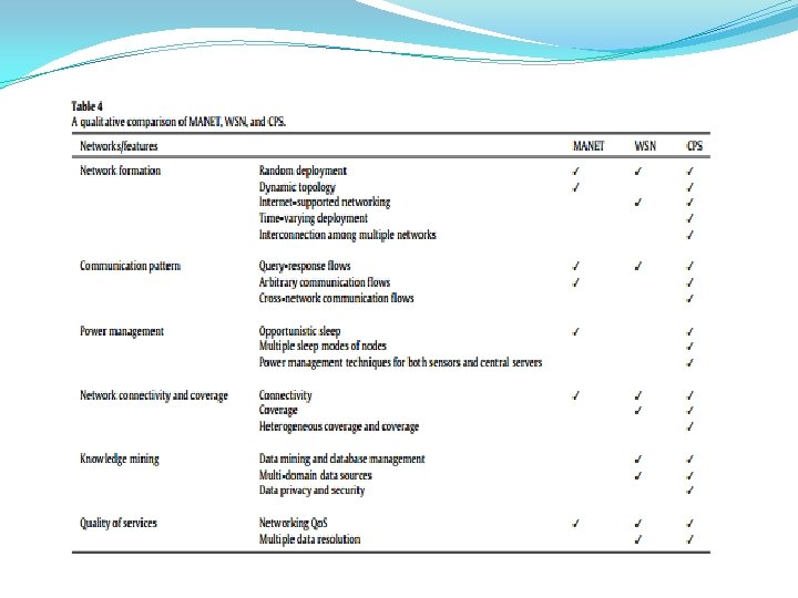 Ø Network coverage: MANET only needs to meet some connectivity requirements, a WSN needs to meet both connectivity and some coverage criteria. CPS imposes the same requirements for a WSN, but different levels of connectivity and coverage for different WSNs. Ø Node mobility: Node mobility in a MANET is usually arbitrary. Very little mobility has been assumed for a WSN. CPS applications, sensing data may be collected from static and mobile sensor nodes. Ø Knowledge mining: MANET emphasizes only on networking issues. A WSN focuses more on collecting and managing sensing data. CPS emphasizes more on how to discover new knowledge across multiple sensing domains and to utilize intelligence properly. Ø Quality of services: Quality of data transmissions is essential for MANET, while quality of sensing data is important for WSN. CPS, emphasizes more on higher-level Qo. S, such as availability of networking and sensing data, security and confidentiality of sensing data , quality of knowledge/intelligence.