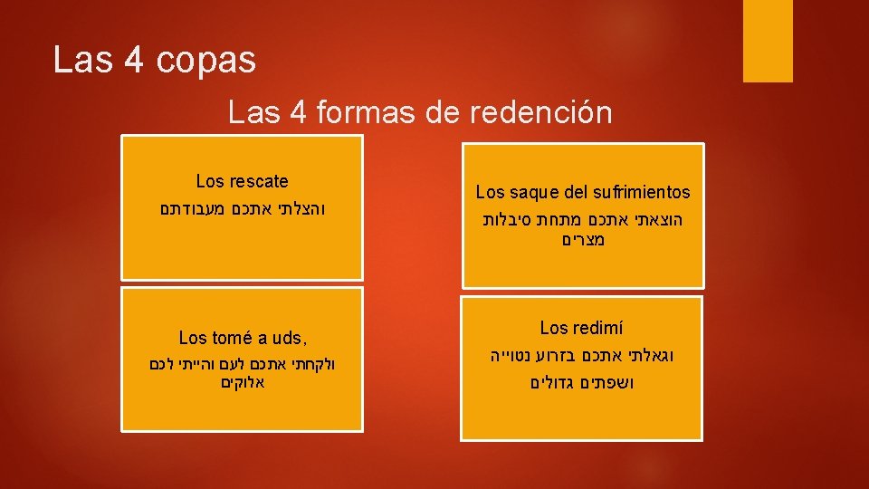 ¿Cómo dejamos el lugar de restricción y negatividad para llegar a la libertad y felicidad? Usemos el ejemplo del pueblo judío como guía. entonces, ¿qué hizo el pueblo judío para salir de Egipto? A pesar de que fue Dios quien los sacó, el pueblo judío causó la salida. El versículo dice: “Los hijos de Israel gimieron por el trabajo y ellos lloraron” (Éxodo 2: 23). El gemido fue una súplica para que el trabajo duro se detuviera, pero el llanto fue un rezo Y nosotros tenemos que hacer lo mismo. Tenemos querer tener mejores pensamientos, hábitos más sanos, relaciones más cercanas No tenemos que tener todas las respuestas, pero nos tiene que importar lo suficiente como para llorar: “¡Aquí estoy! ¡Quiero cosas buenas! ¡Quiero una relación!”. Esa es nuestra parte; entonces pueden ocurrir los milagros. Ese deseo de no huir de los problemas sino avanzar hacia algo positivo es el mensaje de la cuarta palabra de redención Las cuatro copas de vino. A medida que tomamos cada copa, avanzamos por los pasos del proceso de redención, perdiendo los niveles de esclavitud y abriéndonos hacia un mundo de verdadera libertad. Así que para prepararte, lo primero que debes hacer es preguntarte: ¿Qué te está esclavizando? ¿Qué valores o hábitos están evitando que seas quien quieres ser?
