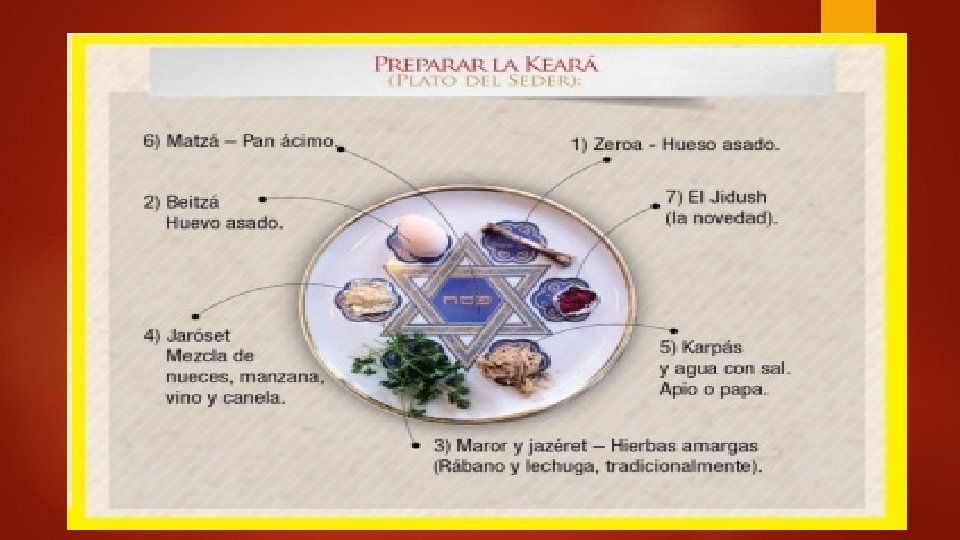 Pata de pollo ( )זרוע : recuerda el “Korban Pesaj” (sacrificio) que se comía esa noche y hoy en día no se come por falta del “Beit Ha. Mikdash” también nos recuerda que D¨s nos saco de Egipto con brazo extendido. Huevo ( )ביצה : Recuerda el “Korban Jaguiga”. La ofrenda festiva que se traía al “Beit Ha. Mikdash” Maror ( )מרור : Simboliza la amargura infligida por los egipcios a el Pueblo de Israel en el pasado. Jaroset ( )חרוסת : este preparado recuerda la mezcla que tenían que preparar para su trabajo Karpas ( )כרפס : alguna verdura papa, cebolla, apio. Es para motivar al niño a preguntar el motivo de esta noche. Jazeret ( ) חזרת los mismos ingredientes que maror. El maror. Matza se comían al mismo tiempo junto al “Korban Pesaj”