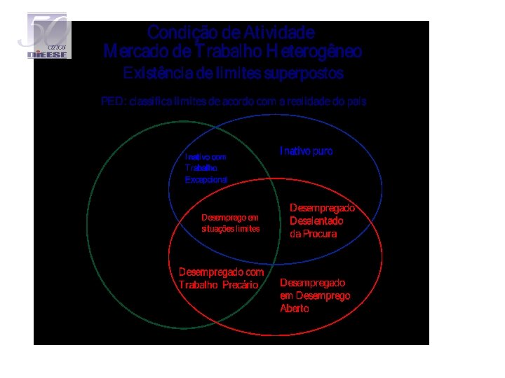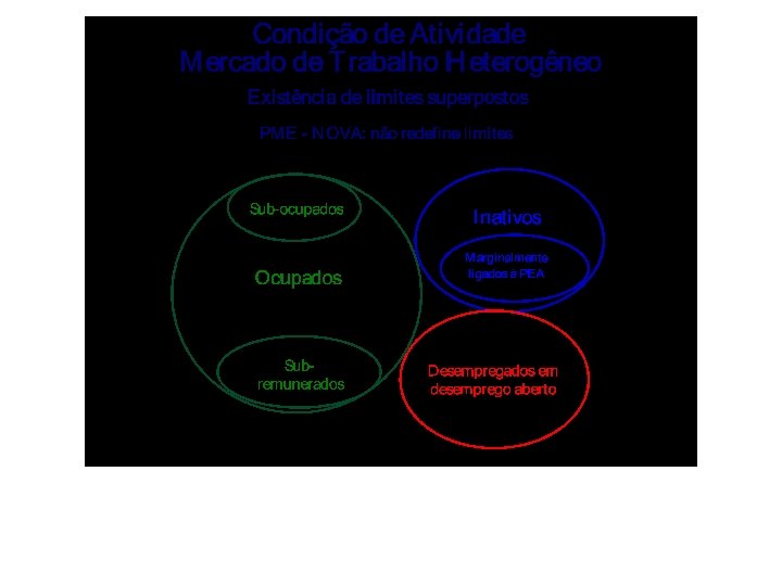 ü Buscou-se que as definições de desemprego, ocupação e inatividade fossem mais coerentes com a realidade do país, através da identificação das manifestações específicas de desemprego e inatividade nossos mercados de trabalho, além da identificação daquelas situações já contempladas pelas pesquisas de mercado de trabalho que adotam as normas internacionais. ü Para tanto as normas internacionais foram consideradas de forma flexível, identificando e reclassificando as situações-limite ou justapostas entre as três categorias de condição de atividade presentes em mercados de trabalho heterogêneos.