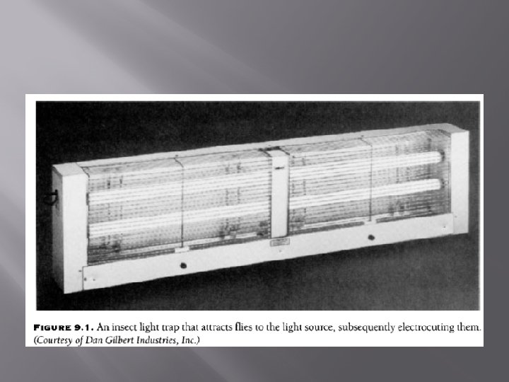 � Ø Ø Ø Nonmechanical insect control involves Insectecutors that utilize a blue light to attract insects and then electrocute them when they come in contact with an electrically charged set of metal rods). Insectocutors should be present in areas where flying insects can be a problem Insectocutors should not be used as alternatives for air doors Insectocutors should not be located too close to doorways so as to serve as insect attractants.