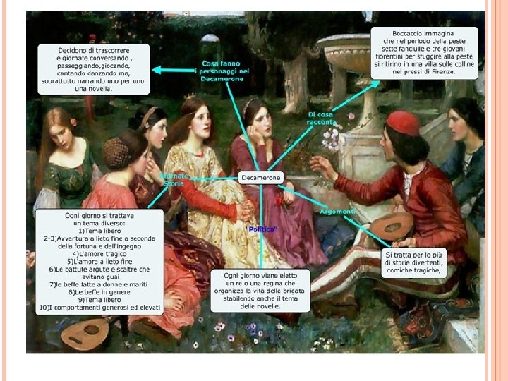BOCCACIO E LA PESTE DI FIRENZE Il Decameron si apre sulla peste a Firenze del 1348: il grandioso affresco di orrori e guasti nel dissolvimento delle regole civili fa da introduzione alle cento novelle raccontate da dieci giovani che hanno deciso di vivere in campagna per "fuggire i disonesti esempi degli altri". Alla violenza fisica e morale del morbo essi contrappongono il diritto a vivere, ma la spensieratezza sarà regolata, ogni giornata sarà scandita da orari e compiti: un tempo per pregare, un tempo per nutrirsi, per danzare, per riposare, un tempo per narrare. E nel narrare è libertà dell’immaginazione, ma la parola rimane decorosa, la malizia elegante, i doppi sensi sottili e intelligenti.