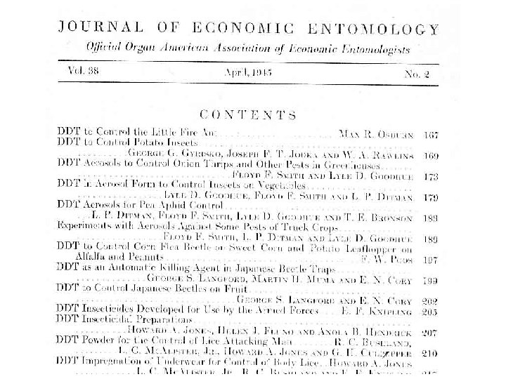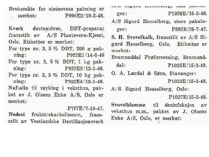 Pesticider fra 1948 • • • • Hexa jordloppepulver Kverk Dustepulver Frukttrekarbolineum Bordeauxvæske Svovelblomme Nikotin Dinitrokresol Blåsyre TEPP Derris 2, 4 -D Na. Cl. O 3 Kvikksølvholdige stoffer Arsenholdige stoffer