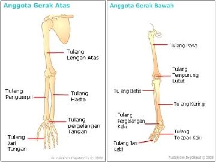 3. Tulang pembentuk anggota gerak a. Tulang anggota gerak atas berupa lengan atau tangan terditi atas : • Tulang lengan atas 2 buah • Tulang hasta 2 buah • Tulang pengumpil 2 buah • Tulang pergelangan tangan 16 buah • Tulang telapak tangan 10 buah • Tulang ruas-ruas jari tangan 28 buah.