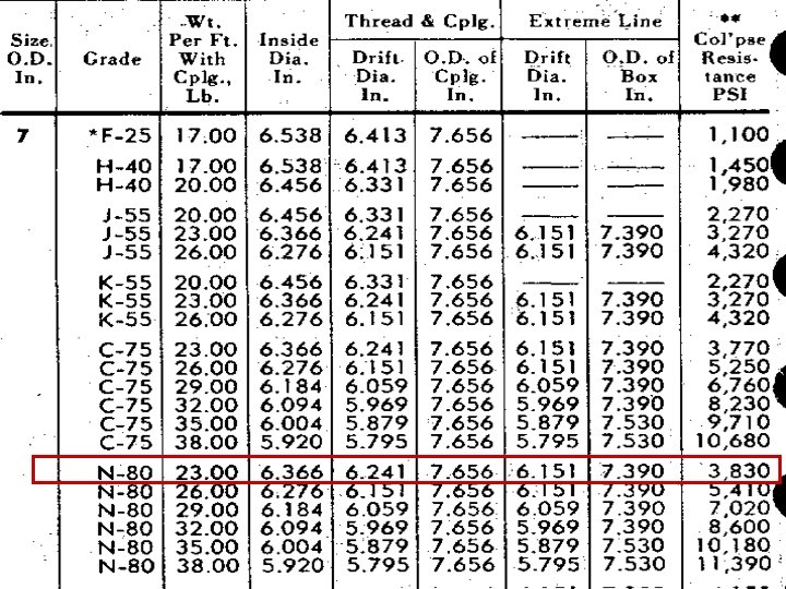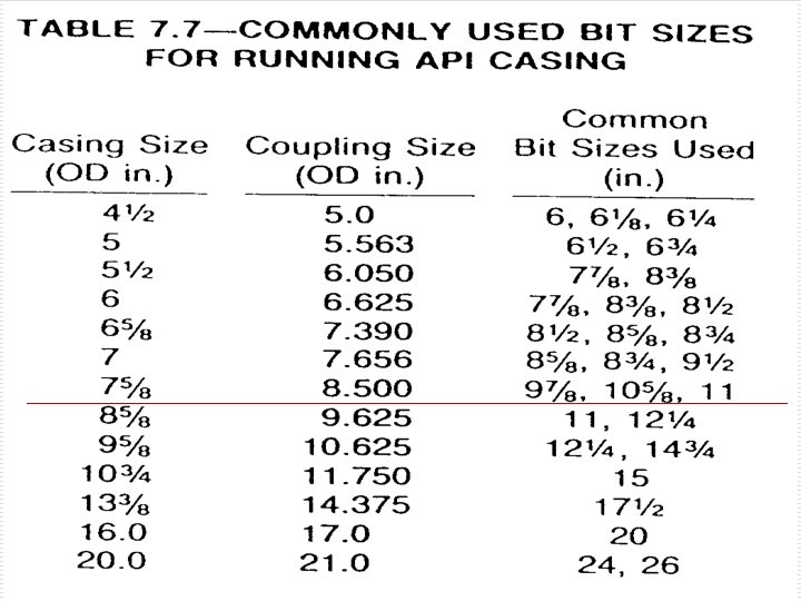 TABLE 7. 8 –COMMONLY USED BIT SIZES THAT WILL PASS THROUGH API CASING Casing Size (O. D. , in) Weight Per Foot (lbm/ft) Internal Diameter (in. ) Drift Diameter (in. ) Commonly Used Bit Sizes (in. ) 4 9. 5 10. 5 11. 6 13. 5 4. 09 4. 052 4. 000 3. 920 3. 965 3. 927 3. 875 3. 795 3 7/8 3¾ 5 11. 5 13. 0 15. 0 18. 0 4. 560 4. 494 4. 408 4. 276 4. 435 4. 369 4. 283 4. 151 4¾ 3 7/8