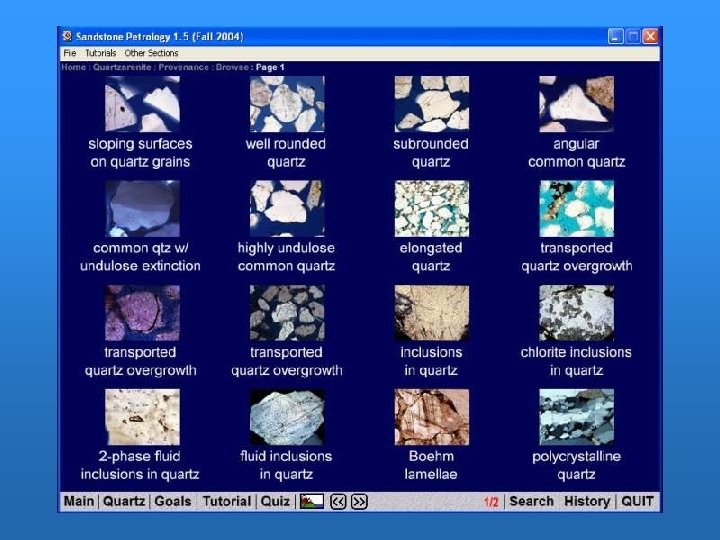 Version 1. 0 • • Focus on basics, for undergraduates Around 300 images Based on Folk Sandstone Class: Q, F, L, others Architecture, compaction, texture Exclusively light microscopy Glossary for sedimentary petrology Funded by NSF and the UT College of Natural Sciences