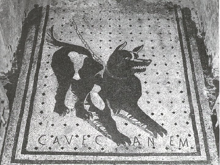 Shock and Awe [29] Ceterum ego dum omnia stupeo, paene resupinatus crura mea fregi. Ad sinistram enim intrantibus non longe ab ostiarii cella canis ingens, catena vinctus, in pariete erat pictus superque quadrata littera scriptum: CAVE CANEM. Et collegae quidem mei riserunt. Ego autem collecto spiritu non destiti totum parientem persequi. • paries, parietis (m) = wall • pingo, pingere, pinxi, pictus = paint • “cave canem” was a common drawing/ inscription in paint or mosaic in the front of a Roman home (c. f. tragic poet in Pompeii) • quadratus, -a, -um = squared/ square-cut • collega, -ae (m) = companion • “totum parietem persequi” – the wall that Encolpius is examining is no longer that of the entrance hall, but rather the porticus which is between the entrance hall and atrium. • ceterum = moreover • paene… resupinatus = I almost fell on my back • intrantibus = with respect to those entering • cella, -ae = room (the doorkeeper had a small room at the entrance of the house) • catena, -ae = chain • vincio, vincire, vinxi, vinctus = bind/ fasten