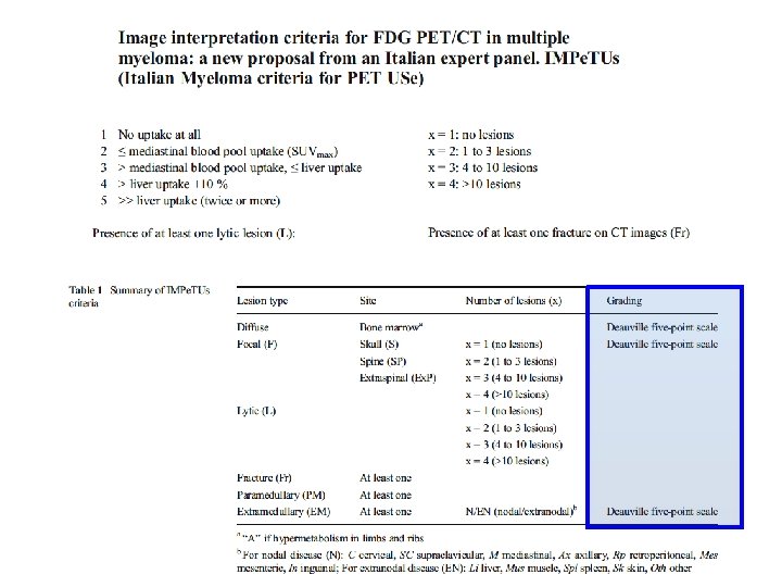 BM 3: Bone marrow uptake (3 means > Med pero < Liver) F 2: Focal lesions 2 means 1 to 3 lesions Extra. Sp “outside the spine” L “LIVER”, EM “extramedullary” EN “extranodal”