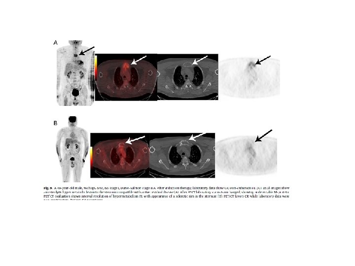Respuesta a la terapia: Mujer 58 años. MM stadio III ISS y IIIA Durie-Salmon Interim PET Respuesta parcial: * Resolución de la mayoría de lesiones focales (lesión esternal +) * Persiste signos de infiltración medular en húmero derecho (> hígado) “Reborde escleroso en TC es un signo de respuesta”