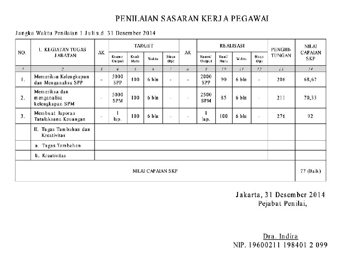PENILAIAN SASARAN KERJA PEGAWAI NEGERI SIPIL Jangka waktu penilaian …. Januari s/d 31 Desember 20…. TARGET REALISASI NO I. Kegiatan Tugas Jabatan AK Kuant /outp ut Kual/ Mutu Wakt u Biaya 1 2 3 4 5 6 7 AK 8 Kuant/ output Kual / Mut u Waktu 9 10 11 Biaya PENGHITUNG AN NILAI CAPAIA N SKP 12 13 14 1 2 3 4 5 II. Tugas Tambahan dan Kreativitas/: a. Tugas Tambahan - - - b. Kreativitas - - - NILAI CAPAIAN SKP Jakarta, 31 Desember 20…. Pejabat Penilai Nama NIP. 8