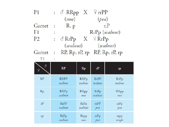 Contoh Pada persilangan ayam berpial rose dengan ayam berpial pea, semua keturunan F 1 nya berpial walnut. Agar lebih memahaminya, perhatikan diagram persilangan berikut;
