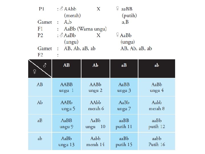 Contoh; Penyilangan antara bunga linaria maraconna berwarna merah (Aabb), dengan bunga linaria maraconna berwarna putih (Aa. BB). Keturunan F 1 nya adalah bunga berwarna ungu (Aa. Bb) yang berbeda dengan warna dari bunga kedua induknya (yaitu merah dan putih). Rasio fenotip F 2 nya adalah 9 ungu; 3 merah; 4 putih.