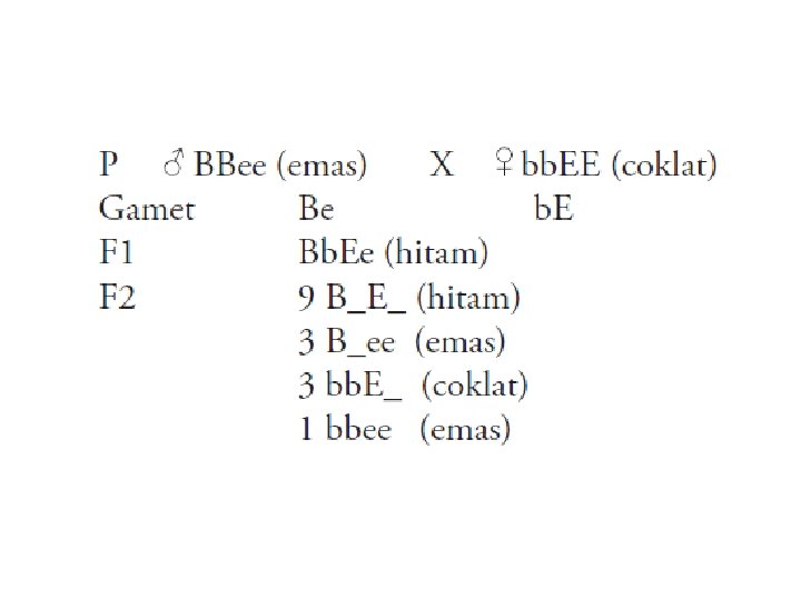 § Persilangan antara anjing berambut emas dan anjing berambut cokelat, dihasilkan keturunan F 1 berambut hitam. § Beberapa gen yang berperan adalah gen B (menentukan warna hitam), gen b (menentukan warna coklat), gen E (menentukan keluarnya warna, dan gen e (menghambat keluarnya warna).