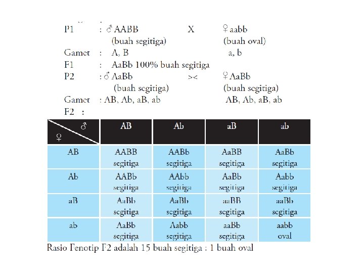 Contoh; Persilangan tanaman Bursa sp yang berbuah oval dengan tanaman Bursa sp yang berbuah segitiga, dihasilkan keturunan F 1 yaitu tanaman Bursa sp semua berbentuk oval. Untuk mengetahui hasil keturan F 2 nya bisa dilihat diagram dibawah ini.