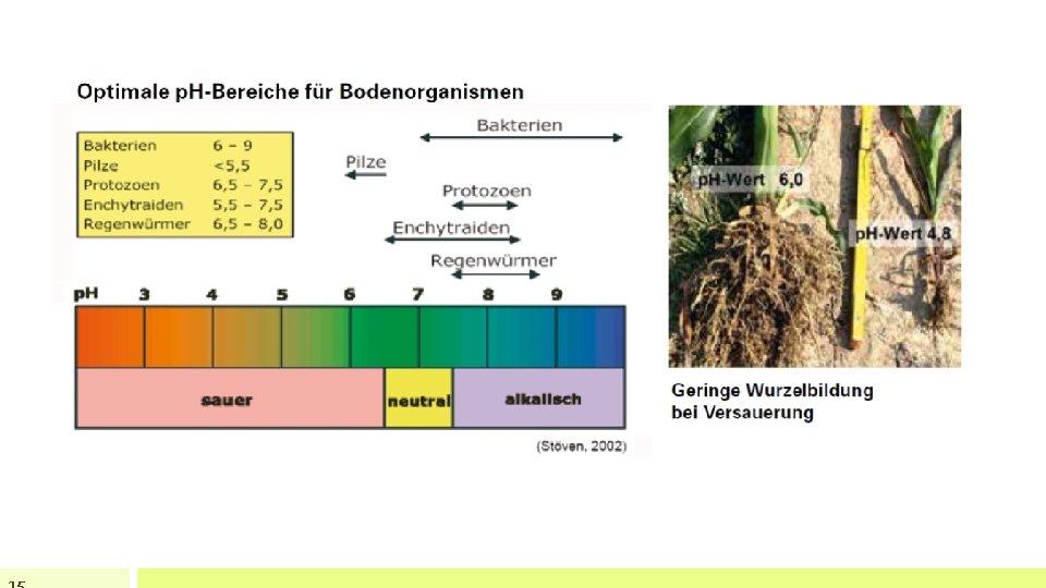Folgen der Bodenversauerung • Hemmung des Bodenlebens (Regenwürmer) sowie der Humusbildung • Verschlechterung der Krümelstabilität (Strukturschäden, Verschlämmung) • Verringerung des Porenvolumens (weniger Wasserspeicherung und Durchlüftung) • Eingeschränkte Nährstoffverfügbarkeit (Phosphor, Stickstoff, Magnesium, Selen) • Schlechtes Kleewachstum durch verringerte Aktivität der Knöllchenbakterien (Molybdän) • Verringertes Wurzelwachstum und damit schlechtere Wasserspeicherung / versorgung • Hemmung der Nitrifikation • Vernässung durch Zerfall der Ton-Humus-Komplexe (Staunässe!)