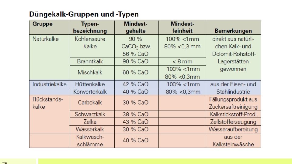 Naturkalke • Branntkalk • entsteht durch Brennen von Kalkstein bzw. Dolomit 900 bis 1200°C • Branntkalke sind schnell wirksam; sehr gute Strukturwirkung • Achtung: Branntkalk nicht für Kopfkalkung bzw. auf feuchten Pflanzenbeständen anwenden ätzende Wirkung • Branntkalk soll nach dem Streuen leicht eingearbeitet werden • Mischkalk • Vermischung von Kohlensaurem Kalk und Branntkalk • schnelle und langsame Wirkung!!