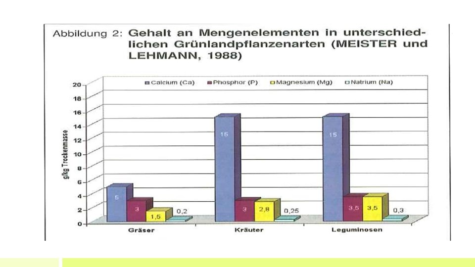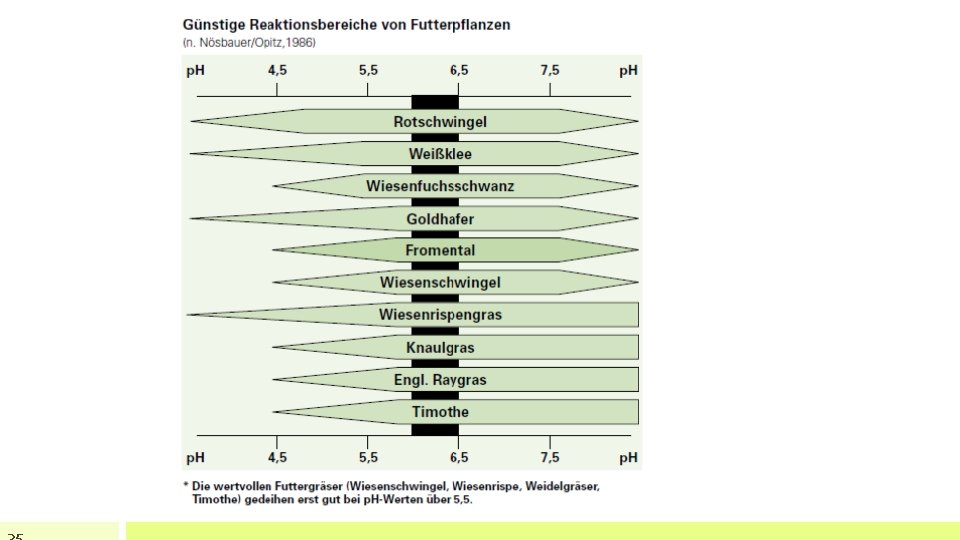 Kalkung im Grünland • Grünland stellt geringere Ansprüche als Ackerland • höhere Aggregatstabilität im Oberboden durch höheren Humusgehalt • ständige Vegetation verhindert Verschlämmung und Erosion • im Grünland genügt Einsatz von kohlensauren Kalken • idealer Zeitpunkt: Herbst nach der letzten Nutzung bzw. im Frühjahr • p. H-Wert von mindestens 5, 5 notwendig Nährstoffverfügbarkeit, biologische Aktivität, Kleewachstum (Luzerne ca. p. H 6, 5) • Grundsatz für Erhaltungskalkung: ca. 1. 000 – 2000 kg kohlensaurer Kalk alle drei bis vier Jahre! (Kalkentzug ca. 50 -120 kg Ca. O je ha) • wertvolle Futtergräser bzw. Leguminosen gedeihen bei höheren p. H-Werten besser