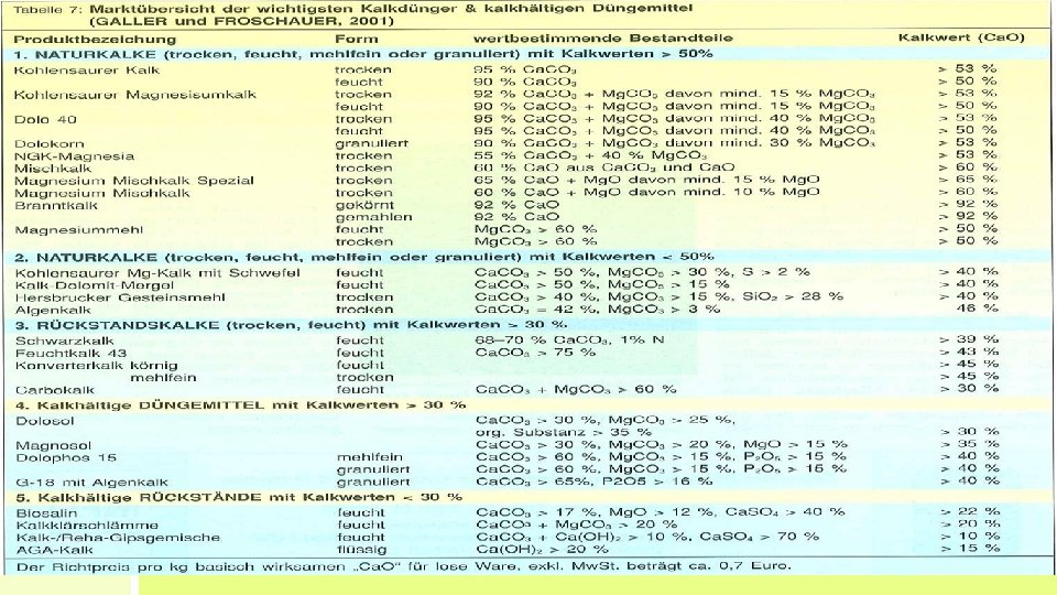 Kalkung und Wirtschaftsdünger • Kohlensaure Kalke können gemeinsam mit Wirtschaftsdünger ausgebracht werden • Spezielle Güllekalke erhältlich werden in die Güllegrube eingeblasen Probleme? ? !! • Brannt- bzw. Mischkalke vorher einarbeiten bzw. Niederschläge abwarten Ammoniakverluste!!