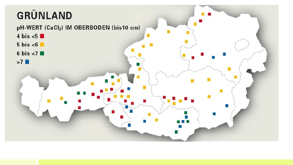 Zusammenhang Viehbesatz – p. H-Wert • Viehbesatz beeinflusst p. H-Wert im Grünland • eine GVE liefert über den Kot jährlich ca. 75 kg Ca. O in den Kreislauf zurück • 1 m³ Rindergülleenthält etwa 3 kg Ca. O und 1, 5 kg Mg. O • Folgen von Extensivierung bzw. geringere Bestoßung von Almen • • rasche Zunahme der Bodenversauerung Phosphor ist schwer verfügbar Pflanzenverfügbarkeit von Kalium, Magnesium und Molybdän nimmt ab wertvolle Futterpflanzen verschwinden Zeigerpflanzen beobachten!!