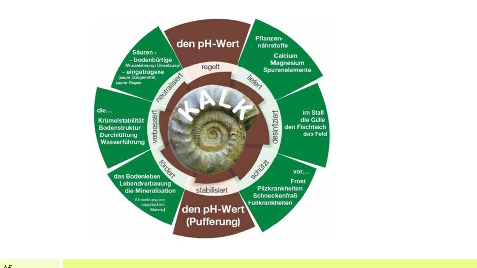 Aufgaben der Kalkung • Kalkung reguliert p. H-Wert neutralisiert Säuren (Bodenversauerung) • Wodurch versauert der Boden? • Atmung der Pflanzenwurzeln und Bodenlebewesen (Kohlendioxid und Kohlensäure) • Regenwasser (p. H-Wert von ca. 5, 5) und durch Auswaschung von basischen Bestandteilen des Bodens (Kalzium, Magnesium) • Organische Säuren, die von den Pflanzenwurzeln ausgeschieden werden und die bei der Humusbildung entstehen • Sauer wirkende Düngemittel (Ammoniumanteil) hoher Carbonatanteil (Ca, Mg) bewirkt, dass der p. H-Wert auf gleichbleibendem Niveau bleiben kann (Pufferung) p. H = potentia hydrogenium