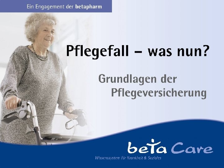 Pflegefall – was nun? Empfehlungen für den Referenten zur Durchführung 1. 2. 3. 4. 5. 6. 7. Zur inhaltlichen Vorbereitung des Vortrags stehen Ihnen der Ratgeber „Pflege“ und Informationen aus dem betanet, der Datenbank für Sozialfragen im Gesundheitswesen (www. betanet. de, Stichwort „Pflege – Pflegeversicherung“), zur Verfügung. Der Vortrag ist auf den Ratgeber „Pflege“ abgestimmt. Dieser kann als Seminarunterlage dienen. Die Texte auf den „Notizenseiten“ (Menü Ansicht) zu diesen Folien sind schlagzeilenartig konzipiert und für Sie als roter Faden während des Vortrags gedacht. Selbstverständlich steht es Ihnen frei, vertiefende Informationen einzubauen, bzw. mit Hinweis auf den Ratgeber zu erwähnen. Hinter den ausgeblendeten Folien verbergen sich weitere Notizenseiten mit Informationen für die vorherige Folie. Die Powerpoint-Präsentation beinhaltet einige Animationen (Textelemente erscheinen erst nach Mausklick). Diese spielen, methodisch eingesetzt, eine wichtige Rolle bei der Erklärung der Inhalte. Sie haben die Möglichkeit, am Ende des Vortrags auf regionale Ansprechpartner (z. B. Beratungsstellen, Selbsthilfegruppen o. ä. ) aufmerksam zu machen. Ab 01. 07. 08 tritt die Pflegereform in Kraft. Änderungen im Leistungsbereich wurden im Vortrag aktualisiert. Die Präsentation beginnt mit Folie, bzw. Seite 2. Viel Erfolg!