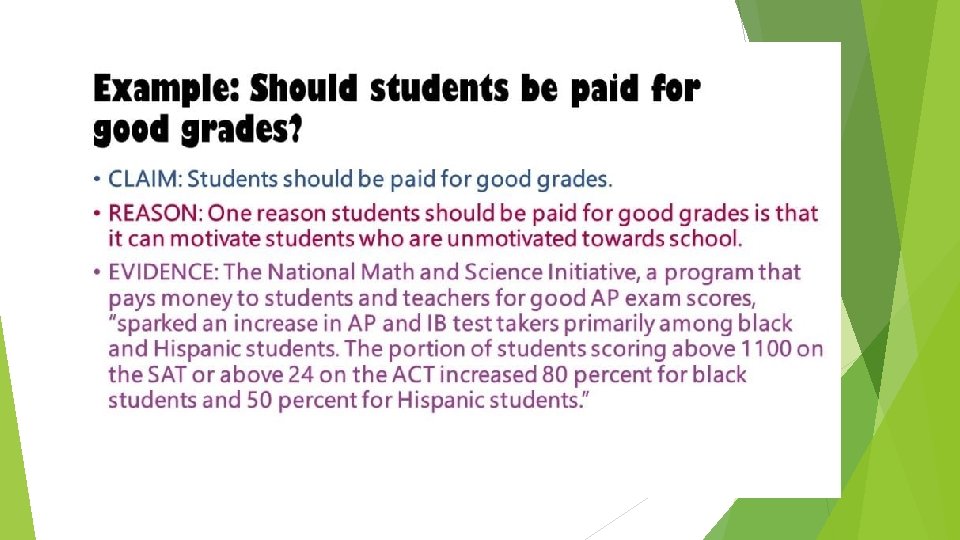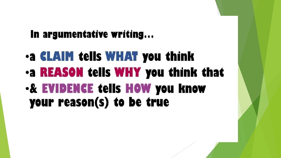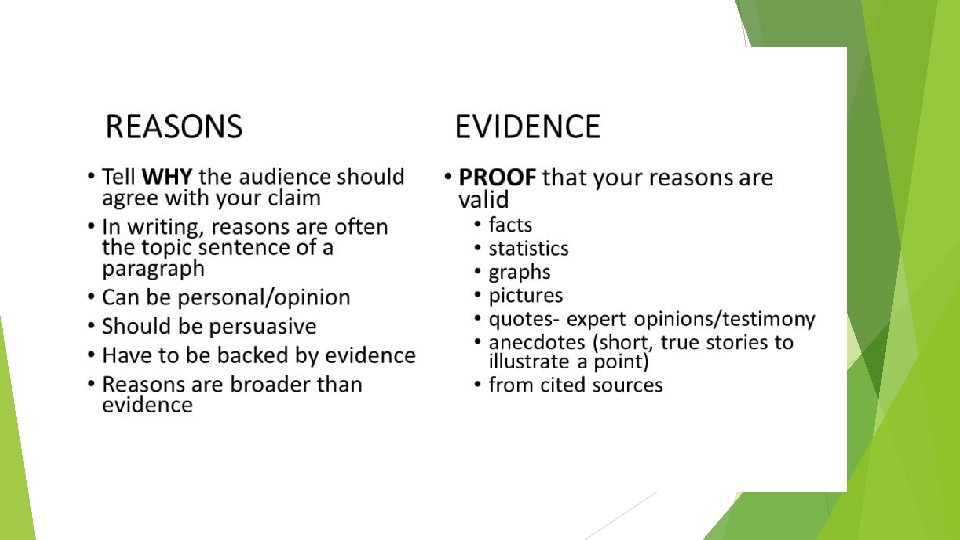 Reasons (the topic sentence of each body paragraph) The opinions the writer gives to show why the claim should be believed Reasons must be valid – means they must support the claim the writer is making Stated after the claim in thesis statement