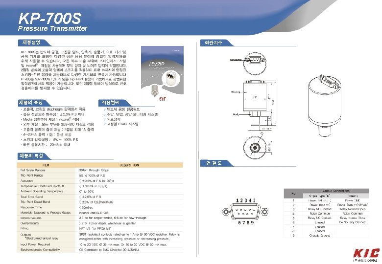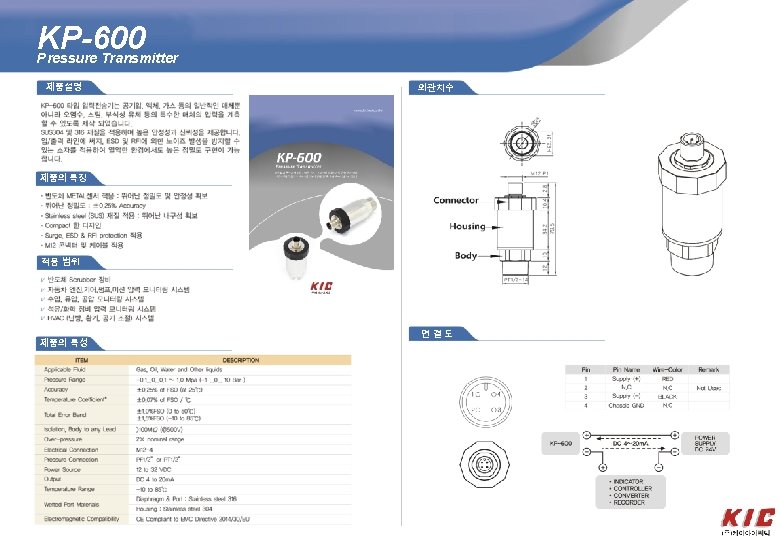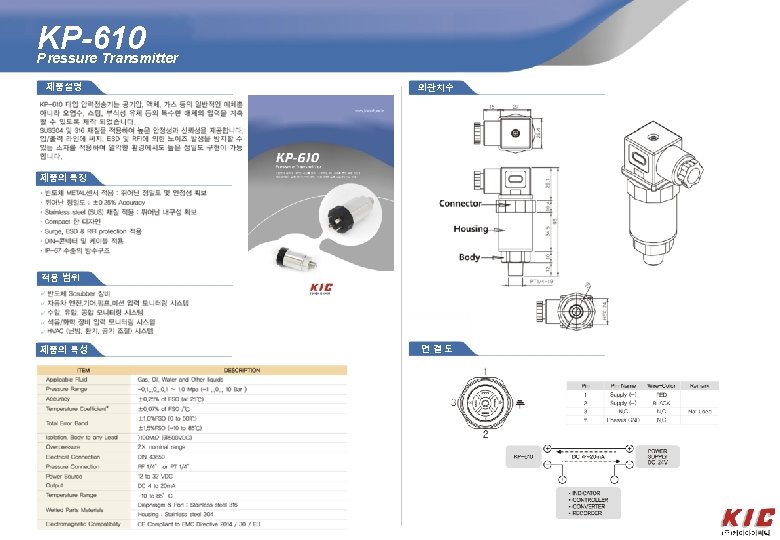 KP-HT 100 A High-temperature Pressure Transmitter 외관치수 Product 제품설명 KP-HT 100 A transmitter uses high temperature pressure sensor as sensing element. The media is transferred onto sensor through heating cooling parts, and high accuracy amplified circuit board is in stainless steel housing, transmitting sensor signal into standard output signal. The whole product is produced through components making, simi-finished product and all-finished product strict testing and aging, having stable and reliable performance. The transmitter is widely used for high and low measurement and control of food, medicine, power station, engineering, automobile, ship manufacture, petroleum, metallurgy, steam and heat exchanging, aviation, spaceflight, and scientific research and laboratory instrument, etc Outline Contruction (Unit: mm) G (P < 16 k. Pa) Construction 제품의 특징 • Full welded sensor with pressure port; protection IP 65; ·Stainless steel contacting with media, good corrosive • resistance; ·High, low and common temperature measurement, good • long-term stability; ·Good anti-impact, anti-shock ability; ·Wider operation 제품의 특성 ITEM DESCRIPTION Pressure range -0. 1 MPa… 0 MPa~ 0. 01 MPa… 160 MPa(G); 0 MPa~ 0. 025 MPa… 60 MPa(A) Overpressure 200%FS or 150 MPa(min. value is valid) Media liquid or gas which is compatible with stainless steel Power supply 10~ 30 VDC, suggested 24 VDC Output signal 4~ 20 m. ADC 2 -wire Load RL≤((U-10)/0. 02)(Ω) Accuracy ± 0. 25%FS, ± 0. 5%FS(including non-lin. , rep. and hys. ) Thermal error ≤± 0. 025%FS/℃(@25℃) Long-term stability ≤± 0. 5%FS/year Endurance 106 pressure cycles Environment temp -40℃~+80℃ Media temp -40℃~+150℃ Relative humility 0~ 90%RH Protection IP 65 Response frequency > 1 k. Hz Insulation 100 MΩ,50 VDC Pressure port and housing stainless steel 1 Cr 18 Ni 9 Ti Wiring plug Hirschmann plug 연결도