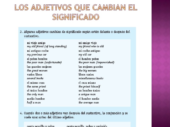 � Los adjetivos calificativos (descriptive) pueden ir delante o después del sustantivo… �Los adjetivos van después del sustantivo cuando distinguen el sustantivo, o no es una característica normal/supuesta. Ejemplo: La casa blanca, el hombre gordo, el perro perezoso �Los adjetivos van delante del sustantivo cuando describen una característica normalmente asociada con ese sustantivo. Ejemplo: los altos picos, la blanca nieve, un complicado sistema