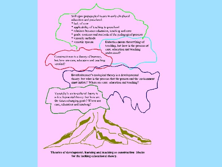 Science-based Preschool * developmental psychology * didactics ”developing didactics” * “developing pedagogics” Teacher students study preschool in teacher education * “more scientific” view of development * “practical theories” about development Preschool teaching *Hakkarainen: ”developing didactics” : narrative logics in action: stories, picture and motor expression, projects, play is very important *the role of teacher is to be a builder of play landscapes, guidance *the fifth dimension operating environment *Pramling: ”in developing pedagogics” the adult follow child’s thinking and that what is happening, no exact methods, only didaktic principles Figure 20 t. The three dimension developing model of the concept of preschool.
