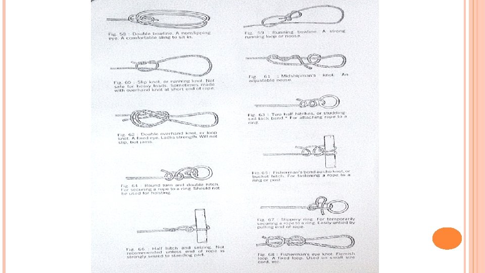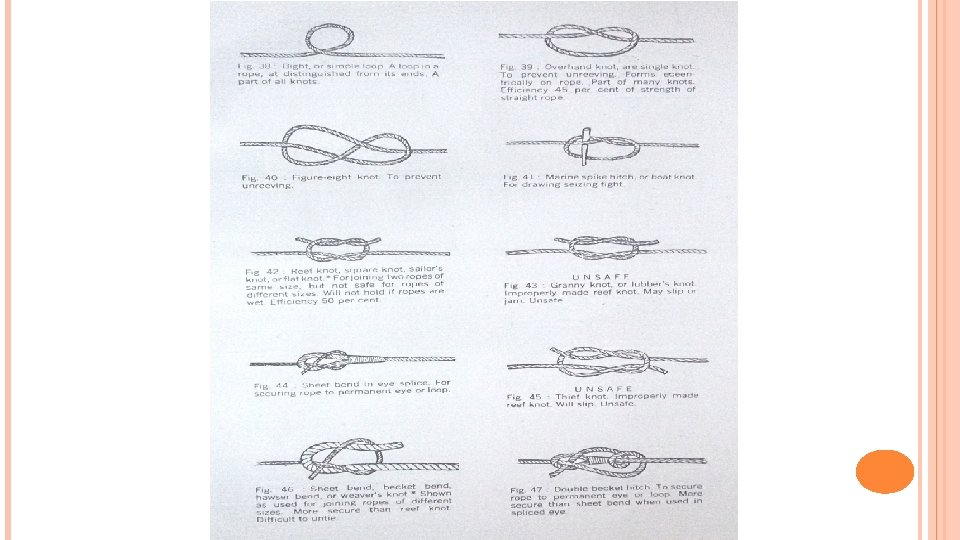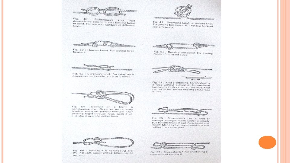 ROPES Good type of cordage but not easily available in India. Depending upon quality & strength further divided as � Grade I : Black twisted threads in three strands. � Grade II : Black twisted threads inserted in two strands � Grade III: Black twisted threads inserted in one strand Hemp Rope : Stronger than Manila when kept in dry but costlier and not available easily. Sisal Rope : Commonly used in field and equivalent to grade III of Hemp. Coir Rope : Not used in field but has a great advantage over others where it comes in contact with water. Manufactured in Kerela. Cotton Rope : Are very strong but easily affected by weather conditions & normally used for erection of tents etc. Spun Yarn Rope : Are used for tying bundles & bags