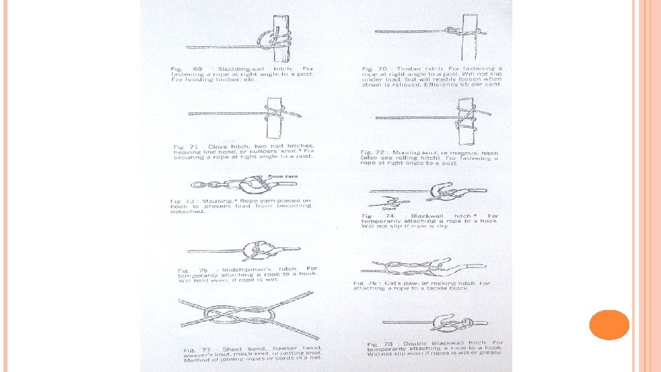ROPES Care of Ropes : (i) End of a cordage should be bound with twine or spun yarn so as to prevent untwisting and process known as whipping (ii) It should not be dragged in marshy soil and on gravel. Abrasive action will wear, cut and fill outside surface with grit. (iii) Let fibre ropes dry before storing them. Moisture hastens rot and causes rope to kink easily. Let a frozen rope thaw completely before you handle it or fibre can break. Let frozen rope dry naturally. (iv) It should be stored on dry platform and in coils well above the floor. Store fibre ropes in a dry cool room with good air circulation – Temp. 10 – 210 humidity 40 -60% (v) It should be properly wound before starting (vi) Protect fibre ropes from weather, dampness & sunlight. Keep away from exhaust gases, chemical fumes, boilers, radiators, steam pipes and other heat sources e. g near welding or flame cutting otherwise sparks and molten metal can cut the rope or set it on fire.