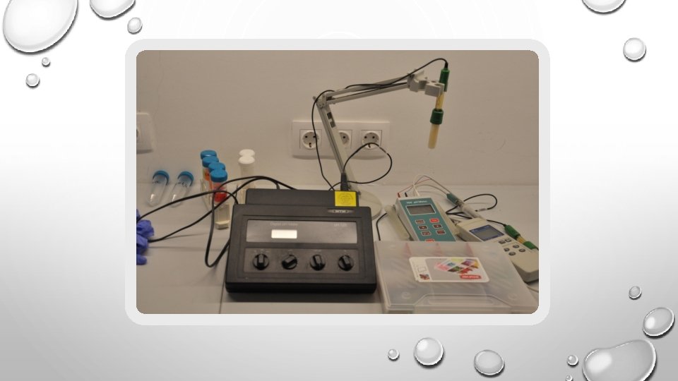 POSTUPAK MJERENJA PH a) PH-METAR – elektronski instrument koji služi za mjerenje p. H tekućih uzoraka - POSTUPAK: 1. kalibriramo p. H-metar tako da sondu uranjamo u epruvete u kojima su puferi poznatih p. H vrijednosti 2. isperemo sondu sa destiliranom vodom 3. sondu uronimo u laboratorijsku čašu, u kojoj je tekućina 4. na ekranu se prikaže koliki je p. H tekućine