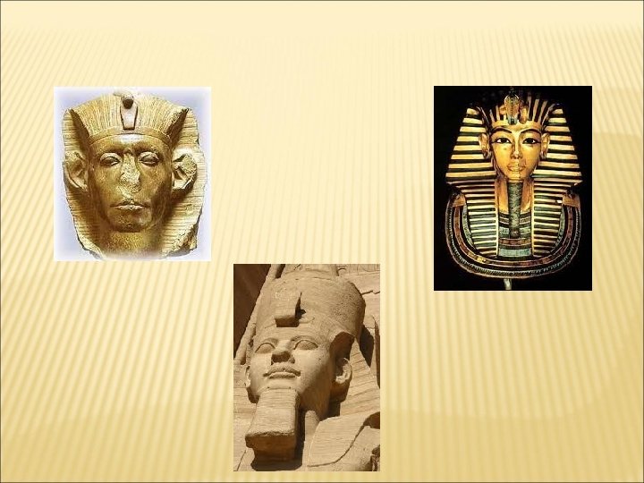 Quelques Pharaons célèbres… l l l Namer (vers 3000 av JC). Il réunit la Basse et la Haute Egypte et devient le premier Pharaon. Djoser (vers 2650 av JC). Il élève la première pyramide, à Saqqarah. Thoutmosis III (vers 1450 av JC). Il domine un immense empire allant de la Nubie au Proche-Orient. L’Égypte est le sommet de sa puissance. Sésostris III (vers 1860 av JC). Il repousse et renforce les frontières égyptiennes. Toutankhamon (vers 1330 av JC). Il ne doit pas sa célébrité à son règne, plutôt insignifiant, mais à son tombeau découvert intact. Ramsès II (vers 1250 av JC). Il consacre une grande partie de son règne à construire des monuments grandioses (comme le temple d’Abou Simbel).