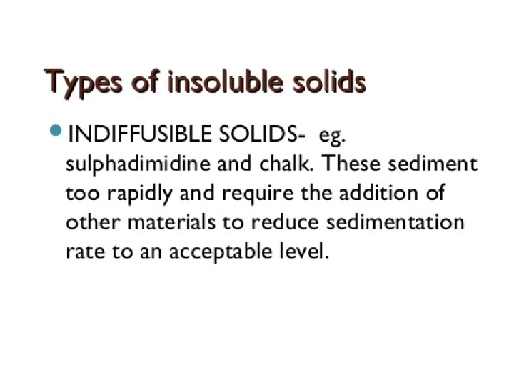 Classification of suspension 1. Suspension containing diffusible solids. 2. Suspension containing indiffusible solids. 3. Suspension containing precipitate –forming liquid. 4. Suspension containing poorly wettable solids. 5. Suspension produced by chemical reaction.