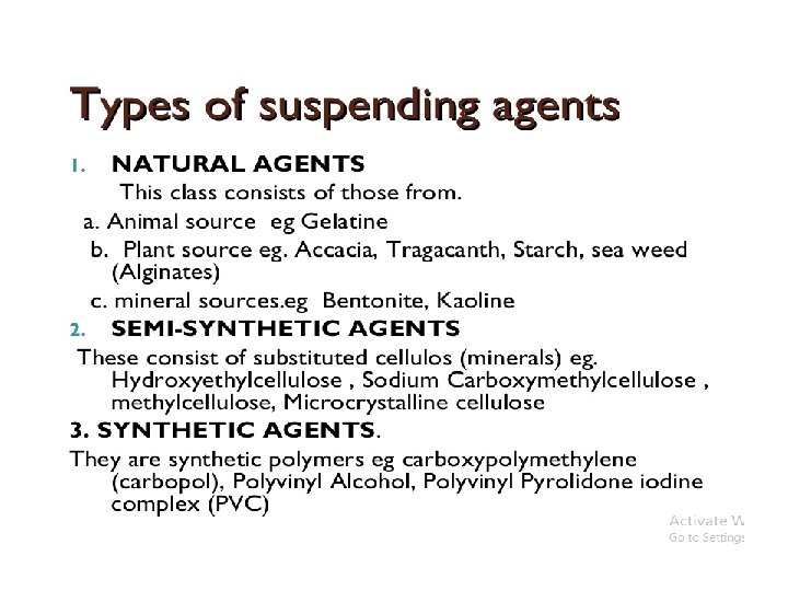 Suspension Preparation containing finely divided particles (referred as suspensoid) distributed somewhat uniformly through out a vehicle in which drug exhibit a minimum degree of solubility ). Advantages of suspensions : 1. it is used in preparation of certain drugs that are chemically unstable in solution form (ex. Antibiotics) 2. It is used to overcome the disadvantages of disagreeable taste of certain drugs when given in solution form (ex. metronidazol suspension)