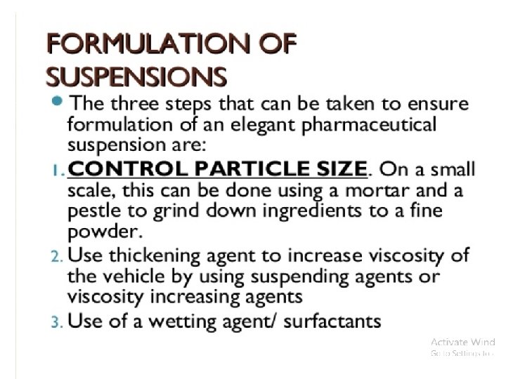 Features desired in pharmaceutical suspension 1. A properly prepared pharmaceutical suspension should settle slowly and should be readily redispersed upon gentle shaking. 2. The characteristics of suspension should be such that the particle size of suspension remains fairly constant through out long periods of undistributed standing (i. e should not able to form hard cake ) 3. The suspension should pour readily and evenly from it´s container.