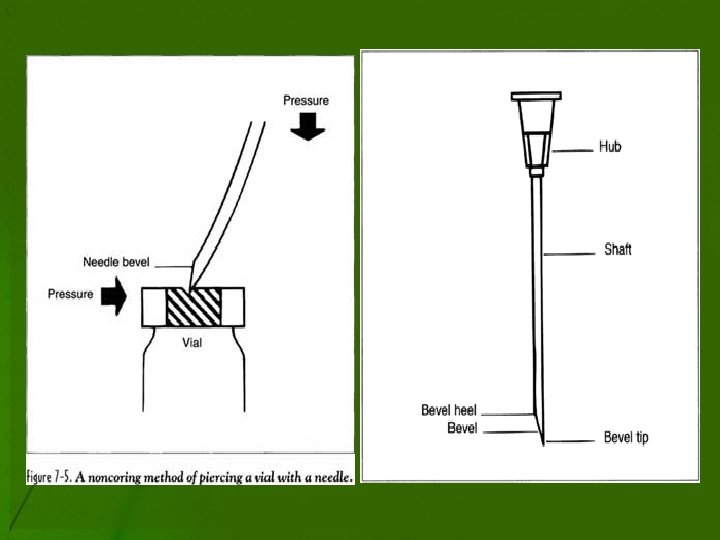 Aseptic Technique- Vials • 1 - Swab rubber closure with 70% alcohol using firm strokes in the same direction in order to prevent contamination. • 2 - Insert needle to penetrate the rubber closure at same point with both tip and heel of bevel to prevent core formation. • 3 - Inject an equal amount of air for the volume of fluid to be removed to prevent vacuum formation. • 4 - Remove an equal amount of air for the volume of diluent added.