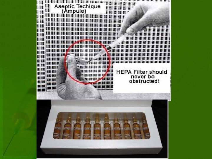 Aseptic Technique- Ampoules • 7 - To avoid glass contamination of ampoule solution • Use 5 micron filter needle to filter glass as solution is pushed out of the syringe • A filter needle can only be used in one direction, otherwise glass particles originally filtered are reintroduced.