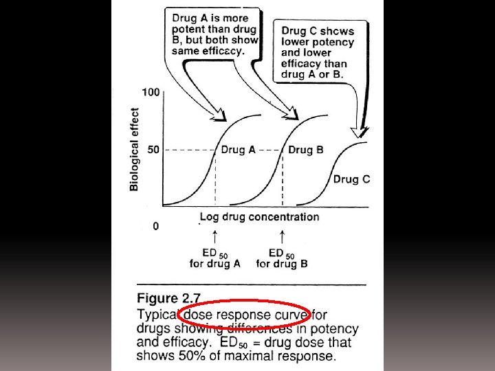 Graded dose-response curve • Magnitude of the drug effect depends on conc. at receptor • drug dose • characteristic of drugs (rate of A, D, M) • efficacy: maximal response produced by a drug • D-R complex and efficiency of the cellular action • potency: how much drug is required to elicit a given response • << the dose needed for a given response >> potent • determined by affinity of R to the D • slope of the dose-response curve