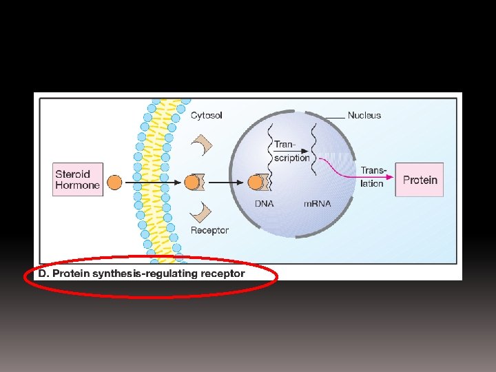 3. Kinase-linked & related receptors: • gen transcription and protein synthesis • Main effect: control cell growth & differentiation • Time scale: hours • Exp: some hormone (e. g. insulin) –R 4. Nuclear receptors: • R is intranuclear D must enter the cell first • Effect: gene transcription protein synthesis • Time scale: hours • Exp: receptor for steroid hormone, thyroid hormone