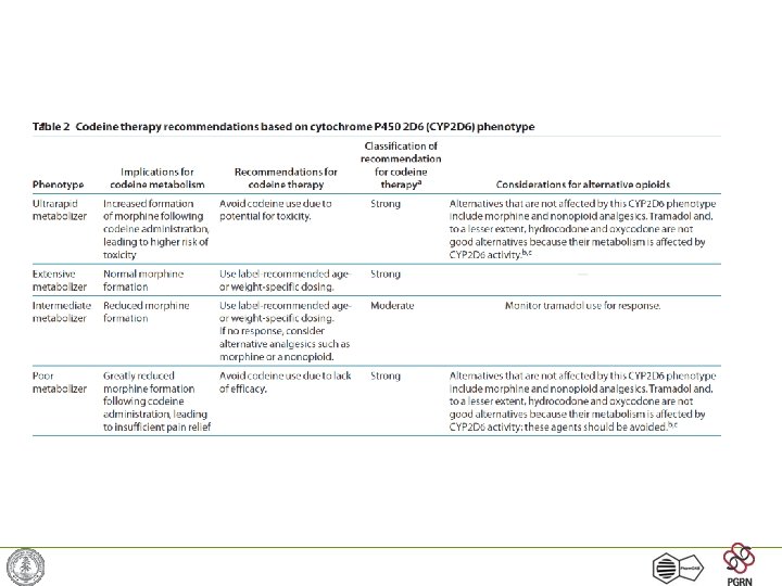 Example: Codeine & CYP 2 D 6 • Codeine is a commonly used opioid – must be metabolized into morphine for activity • CYP 2 D 6 is the protein that performs this metabolism • 7% of caucasians have a variant version of CYP 2 D 6 with no activity -> codeine does not work Pharm. GKB -- http: //www. pharmgkb. org/