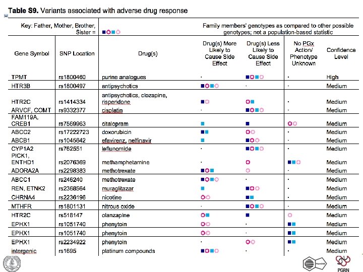 Summary of Pharmacogenetic Bad News Drug Summary Level of Evidence PMID Gene rs. ID Clopidogrel & CYP 2 C 19 substrates CYP 2 C 19 poor metabolizer, many drugs may need adjustment. High 19106084 CYP 2 C 19 rs 4244285 Warfarin Requires lower dose High 15888487 VKORC 1 rs 9923231 Warfarin Requires lower dose High 19270263 CYP 4 F 2 rs 2108622 Metformin Less likely to respond Medium 18544707 CDKN 2 A/B rs 10811661 Troglitazone Less likely to respond Medium 18544707 CDKN 2 A/B rs 10811661 Cisplatin Increased risk of nephrotoxicity Low 19625999 SLC 22 A 2 rs 316019 Citalopram May increase risk of suicidal ideation during therapy Low 17898344 GRIA 3 rs 4825476 Escitalopram; Nortriptyline Depression may not respond as well Low 19365399 NR 3 C 1 rs 10482633 Morphine May require higher dose for pain Low relief 17156920 COMT rs 4680 Paclitaxel Cancer may respond less well Low 18836089 ABCB 1 rs 1045642 Pravastatin May require higher dose Low 15116054 SLCO 1 B 1 rs 2306283 Talinolol May require higher dose Low 18334920 ABCC 2 rs 2273697 Sildenafil May not respond as well Low 12576843 GNB 3 rs 5443