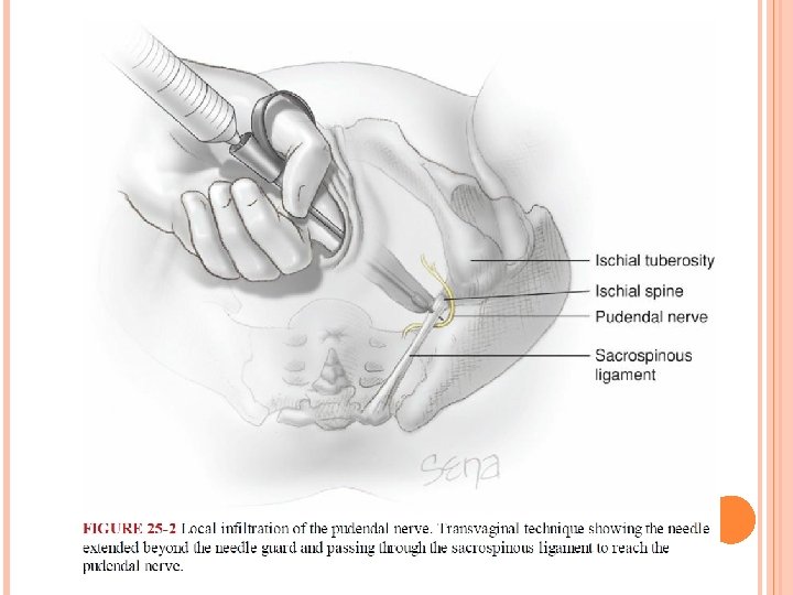 PUDENDAL BLOCK Pain with vaginal delivery arises from stimuli from the lower genital tract. These are transmitted primarily through the pudendal nerve, the peripheral branches of which provide sensory innervation to the perineum, anus, vulva, and clitoris. Sensory nerve fibers of the pudendal nerve are derived from ventral branches of the S 2 through S 4 nerves.