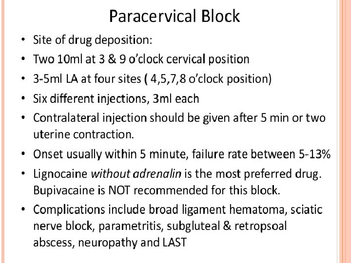 PARACERVICAL BLOCK This block usually provides satisfactory pain relief during first-stage labor. However, because the pudendal nerves are not blocked, additional analgesia is required for delivery. Because these anesthetics are relatively short acting, paracervical block may have to be repeated during labor. Fetal bradycardia is a worrisome complication that occurs in approximately 15 percent of paracervical blocks. Bradycardia usually develops within 10 minutes and may last up to 30 minutes.