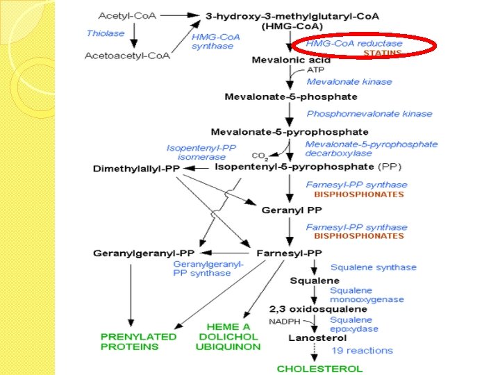 Interaction avec le métabolisme d’une substance endogène �Le blocage ou la stimulation de la synthèse ou de la dégradation d’une substance endogène sont fréquemment en jeu dans les mécanismes d’action des médicaments. ◦ Ex : Inhibition de la synthèse du cholestérol par inhibition de l’HMG-Co. A réductase qui assure la synthèse de l’acide mévalonique précurseur du cholestérol (= mécanisme d’action principal des statines).