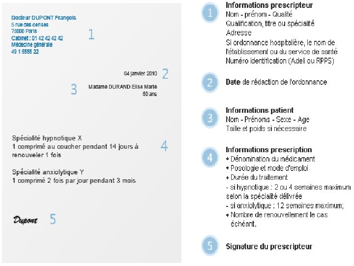 Prescription des médicaments soumis à la réglementation La prescription doit contenir : �Date �Identification du prescripteur : nom, prénom, fonction. n° RPPS (Répertoire Partagé des Professionnels de Santé) �Signature identifiable �Identification du patient : nom, prénom, sexe, date de naissance ou âge, poids (obligatoire pour l’enfant), taille (si nécessaire), surface corporelle (anticancéreux), clairance de la créatinine (recommandée pour les personnes âgées). . .