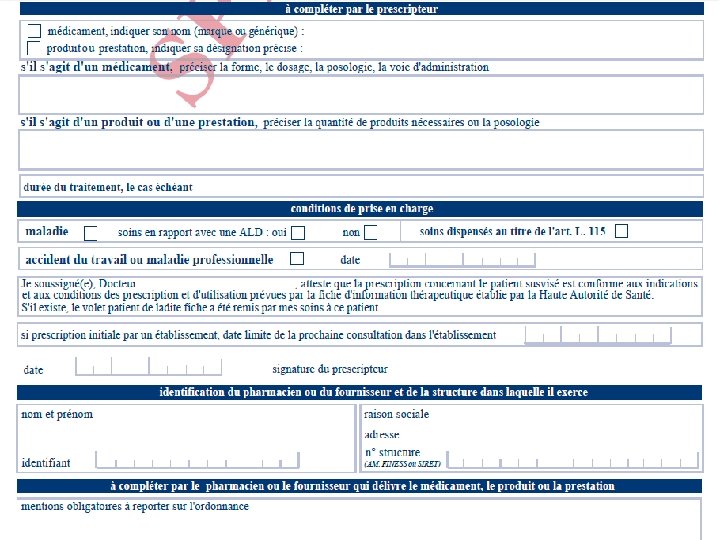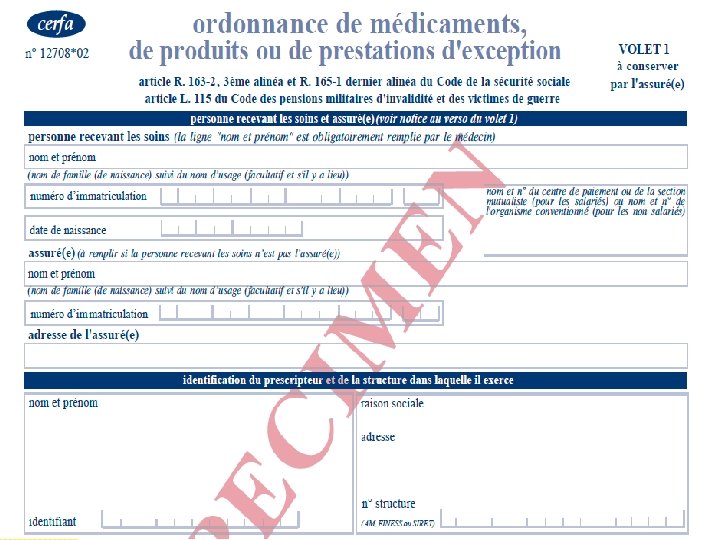 Médicaments d’exception � Médicaments innovant et couteux - ordo spécifique � Spécialités coûteuses remboursables uniquement dans certaines indications rappelées sur une fiche d’information thérapeutique � Ordonnance spéciale “médicaments d’exception” ◦ Le médecin atteste l’adéquation de la prescription aux indications remboursables (poso, durée tt) � Dispensation en officine de ville (4 volets) ◦ Un pour l’assuré ◦ Deux joints à la feuille de soin (dont un pour contrôle) ◦ Un pour le pharmacien