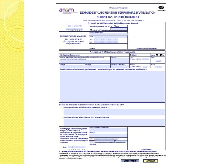 ATU nominative � Concerne � Délivrée essentiellement les médicaments importés pour un seul malade nommément désigné � Demande argumentée faite directement par le prescripteur et transmise via pharmacien ◦ Formulaire CERFA ◦ Initiales patient, tt prévu (dénomination / poso / durée), indication, justification (seule alternative thérap. envisageable) � Responsabilité entièrement prise par le prescripteur
