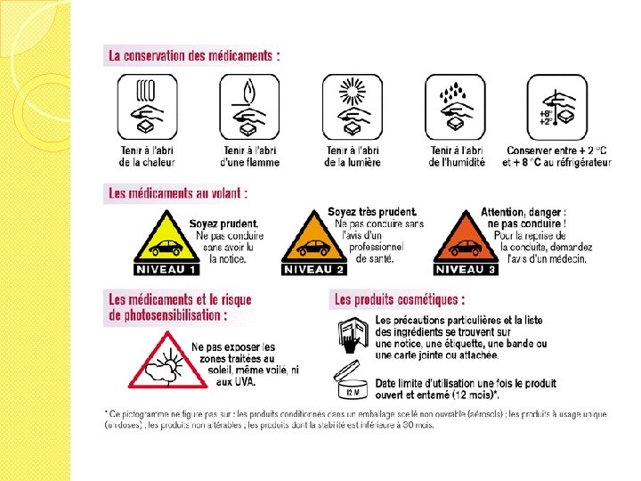 Catégories de médicaments �Spécialités pharmaceutiques Médicaments préparés à l’avance par l’industrie ◦ Dénomination �Nom commercial �DCI : dénomination Commune Internationale �Dénomination chimique Ex : Doliprane®, Dafalgan® = paracétamol (antalgique) = para-acétamido-phénol ◦ Mentions obligatoires �Conditionnement primaire �Conditionnement secondaire �Notice / RCP